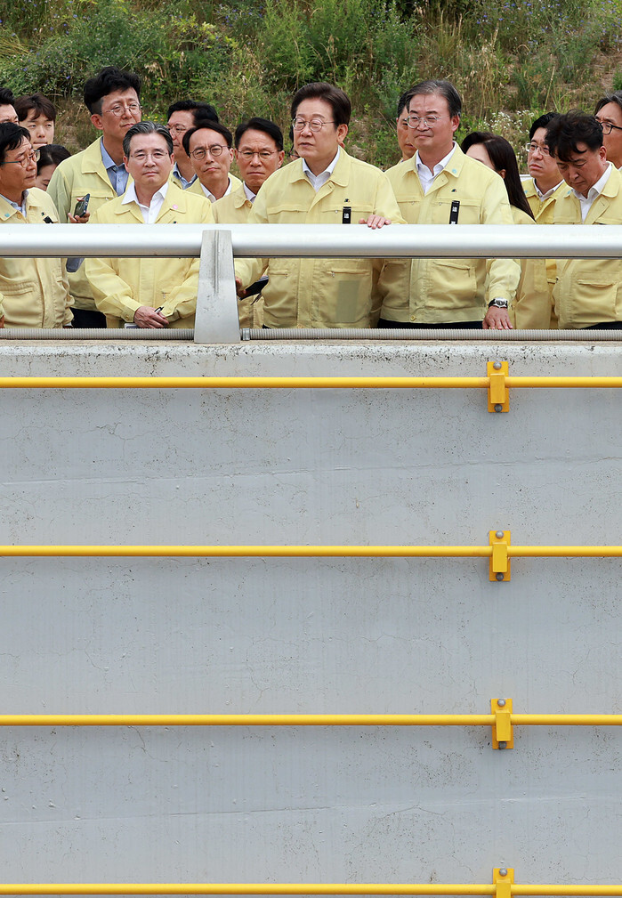 President Lee Jae Myung (C) visits an underground roadway in the town of Osong in the city of Cheongju, central South Korea, on July 14, 2025, to pay tribute to 14 people who were killed in the flood-hit tunnel following the overflowing of a nearby river triggered by torrential rain on July 15, 2023. (Pool photo) (Yonhap)