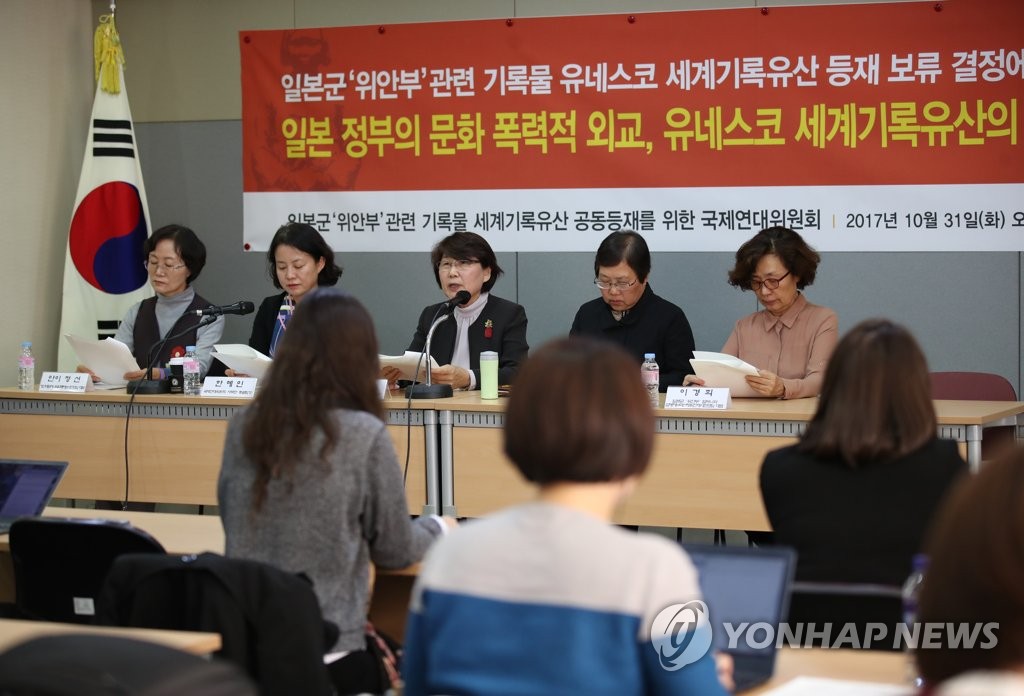 | ▲ '일본 정부의 문화 폭력적 외교 규탄한다!' 2017년 10월 31일 오후 서울 동북아역사재단 대회의실에서 열린 일본군 위안부 관련 기록물 '일본군 위안부의 목소리'의 유네스코 세계기록유산 등재보류 결정에 대한 국제연대위원회 기자회견에서 신혜수 국제연대위원회 사무단 단장이 기자회견문을 낭독하고 있다. [연합뉴스 자료사진] |