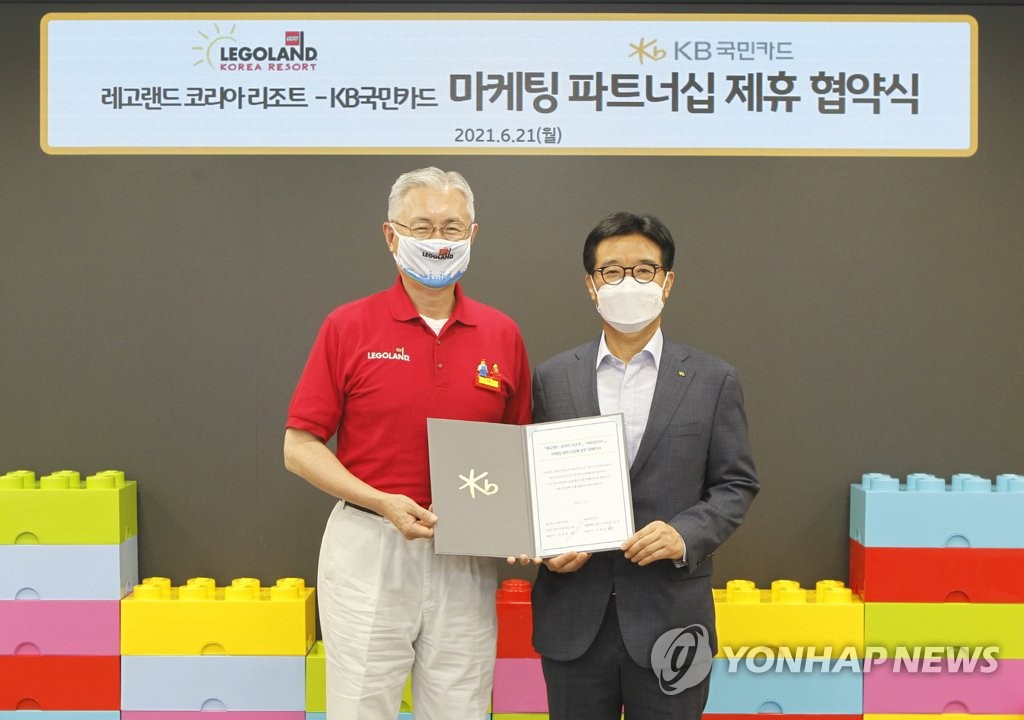 | ▲ KB국민카드-레고랜드 코리아 리조트, 마케팅 파트너십 제휴 협약 (서울=연합뉴스) 이동철 KB국민카드 사장(오른쪽)과 김영필 레고랜드 코리아 리조트 사장이 21일 서울 종로구 KB국민카드 본사에서 '마케팅 파트너십 제휴 협약'을 체결한 뒤 기념촬영을 하고 있다. 2021.6.21 [KB국민카드 제공. 재판매 및 DB 금지] photo@yna.co.kr |