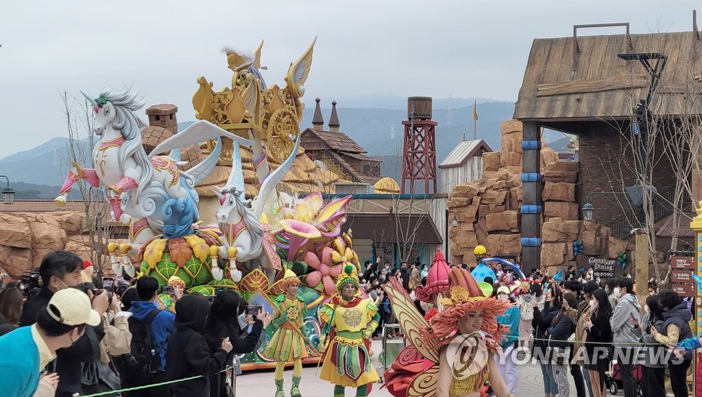 | ▲ 롯데월드 부산, 동화속 왕국 (부산=연합뉴스) 조정호 기자 = 17일 부산 기장군 오시리아 관광단지 테마파크 부지에 들어선 롯데월드 어드벤처 부산에서 공식 개관(3월 31일)을 앞두고 각종 캐릭터 등이 화려한 퍼레이드를 펼치고 있다. 15만8천㎡(4만8천여 평) 규모인 롯데월드 부산은 '동화 속 왕국'을 주제로 6개 테마 구역과 17종 탑승·관람 시설을 선보인다. 2022.3.17 ccho@yna.co.kr |
