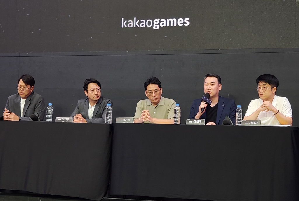 | ▲ '아레스' 소개하는 카카오게임즈·세컨드다이브 제작진 (서울=연합뉴스) 김주환 기자 = 카카오게임즈와 '아레스: 라이즈 오브 가디언즈' 제작사 세컨드다이브 관계자들이 10일 오후 서울 송파구 '비타500 아프리카 콜로세움'에서 열린 간담회 자리에서 질문에 답하고 있다. 왼쪽부터 카카오게임즈 김태형 사업실장, 이시우 CBO, 세컨드다이브 김기범 테크니컬 디렉터, 김태우 시스템 기획실장, 권태균 콘텐츠 기획실장. 2023.7.10 jujuk@yna.co.kr |