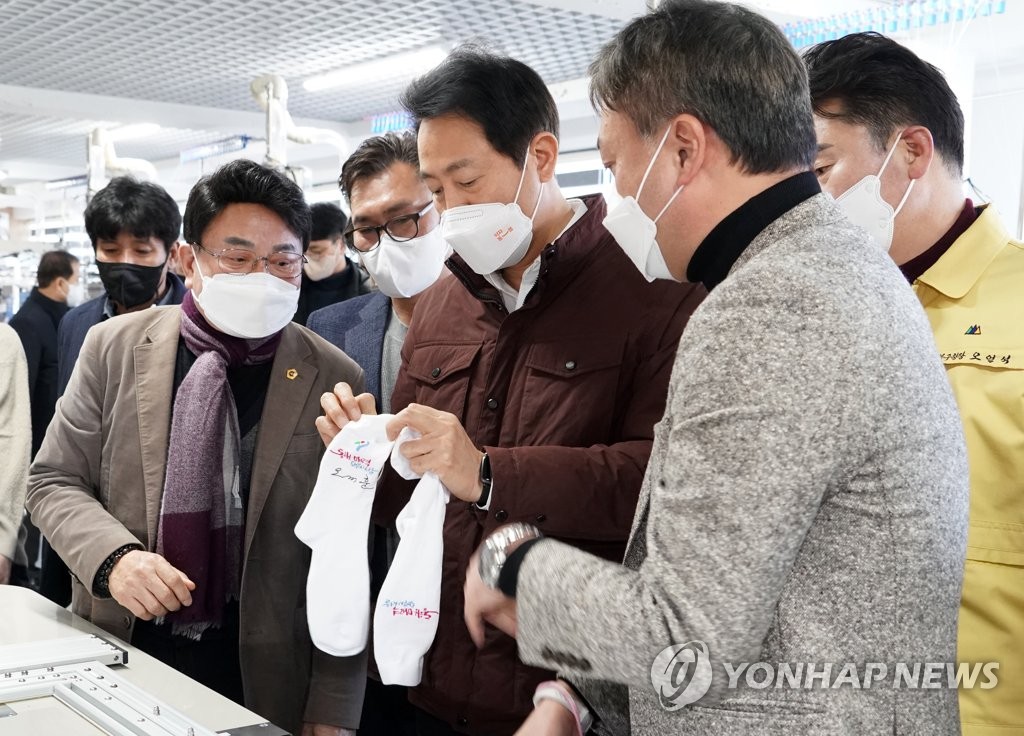 (서울=연합뉴스) 고현실 기자 = 오세훈 서울시장이 설을 앞둔 20일 양말 제조공장과 전통시장을 잇달아 찾아 민생 현장을 점검했다.