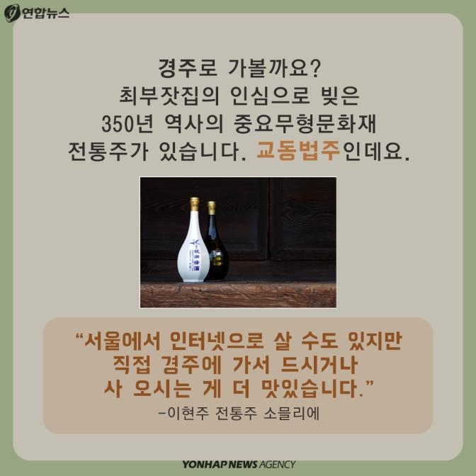 경주로 가볼까요? 최부잣집의 인심으로 빚은 350년 역사의 중요무형문화재 전통주가 있습니다.