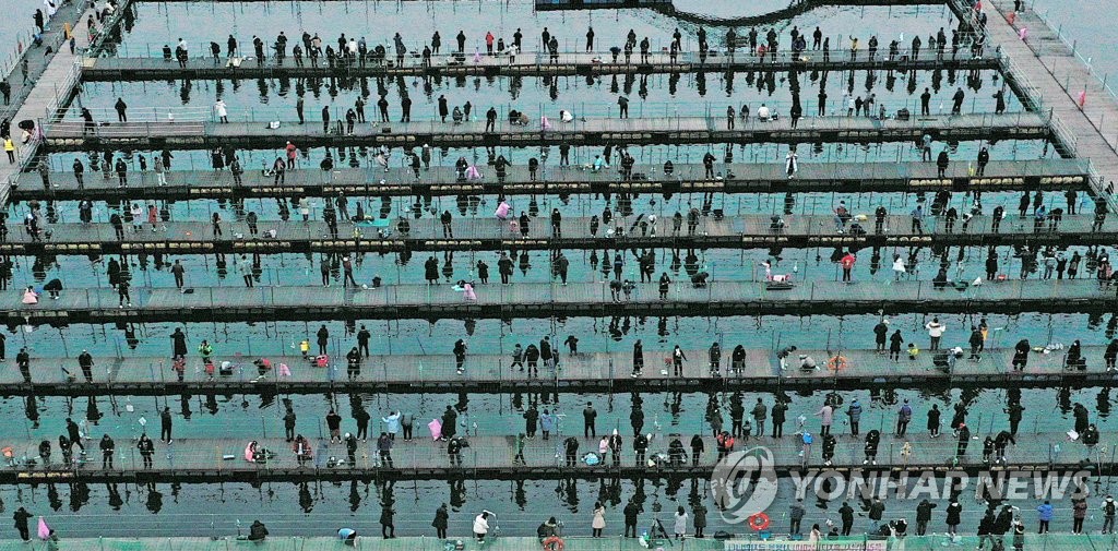 | ▲ 2020 화천산천어축제 당시 낚시터에 얼음이 제대로 얼지 않아 수상낚시터 조성. [연합뉴스 자료사진] |