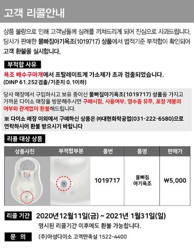 해당 제품은 대현화학공업의 아기 욕조 코스마(KHB_W5EF8A6)로, 다이소에서는 상품명 '물빠짐아기욕조'(제품번호 1019717)로 판매됐다.