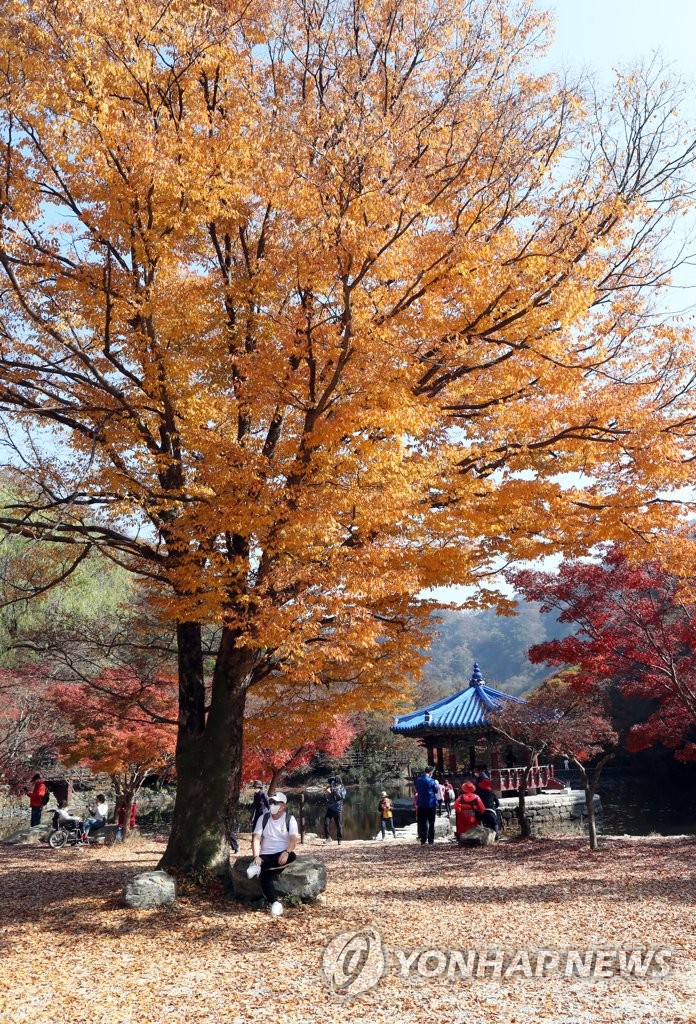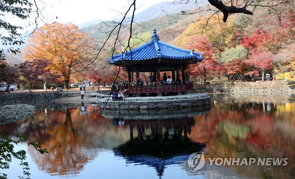 (정읍=연합뉴스) 최영수 기자 = 우리나라 남쪽 지역에서 최고로 손꼽히는 단풍 관광지인 전북 정읍시 내장산국립공원이 울긋불긋 물들어가고 있습니다.