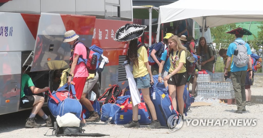 | ▲ 영국 대원들, 잼버리 야영장 나갈 준비 (부안=연합뉴스) 최영수 기자 = 2023 새만금 세계스카우트잼버리에 참가한 영국 대원들이 6일 전북 부안군 야영장에서 철수를 위해 버스에 짐을 싣고 있다. 2023.8.6 kan@yna.co.kr |