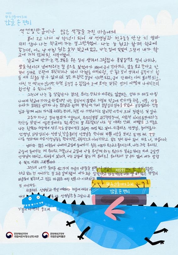▲ 한글 손편지 공모전 대상에 경남 사남초 윤준겸 군 = 국립한글박물관은 국립어린이청소년도서관과 함께 8일 '제8회 책 속 인물에게 보내는 한글 손편지 공모전' 시상식을 한다.