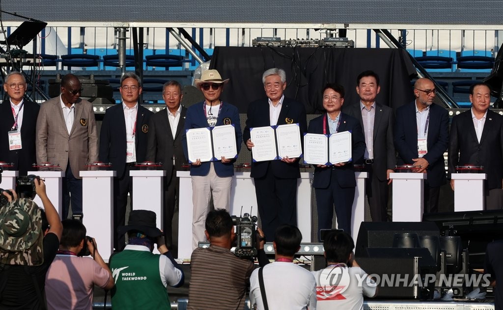 | ▲ '강원·춘천세계태권도문화축제' 3자 협약식 지난 19일 강원 춘천시 송암 스포츠타운 주경기장에서 열린 '강원·춘천세계태권도문화축제' 개막식에서 조정원 WT 총재와 김진태 도지사, 육동한 시장이 3자 협약서에 서명한 뒤 기념 촬영. [연합뉴스 자료사진] |