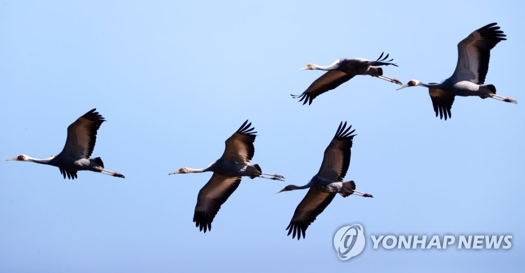(창원=연합뉴스) 절기상 서리가 내린다는 '상강' 이튿날인 지난 24일 국내 최대 철새도래지인 경남 창원시 의창구 동읍 주남저수지에서 재두루미 20여 마리가 포착됐다.