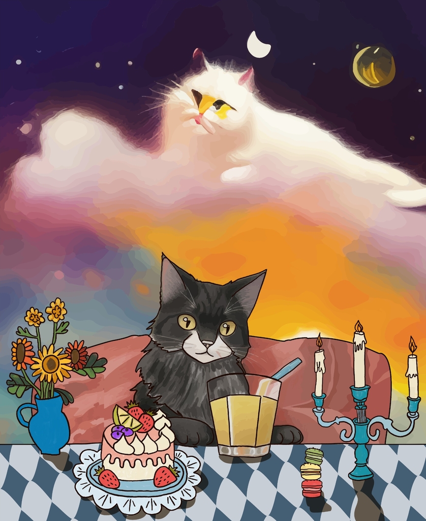 박다원 교육생의 작품 '고양이 세레나데'는 구름 위에 올라간 흰색 고양이와 프러포즈를 위해 기다리는 검은색 고양이의 두근거리는 순간을 포착했는데, 인공지능 명령어로 'a Cat on a cloud, The cat above the night sky'를 입력해 구름 위로 올라가 달과 별을 바라보는 고양이를 표현했다.
