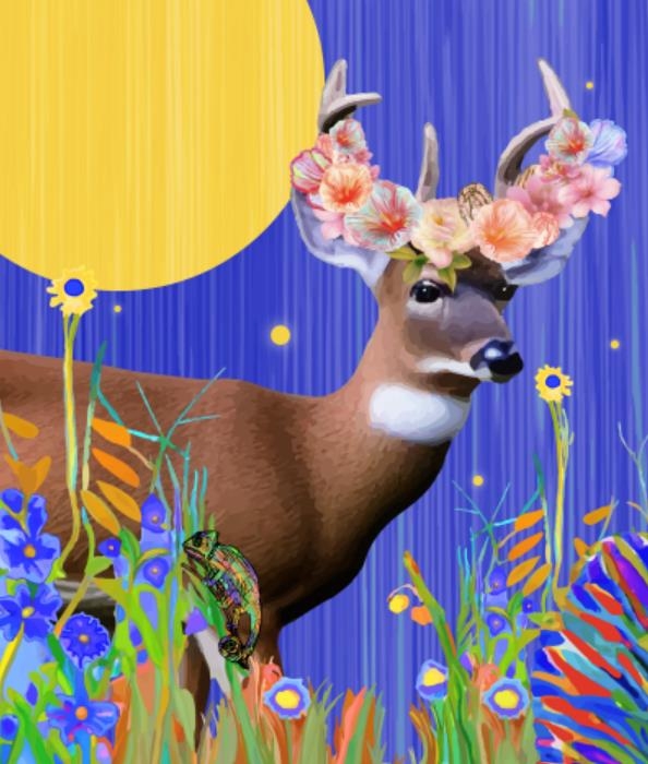 김희주 교육생은 인공지능 명령어로 'a flowering deer surrounded by wild flowers'를 입력하는 방식으로 사슴의 뿔에 화관을 덧입혀 숲의 주인공으로서 존재감을 더한 작품 '생명의 뿔'을 제작했다.