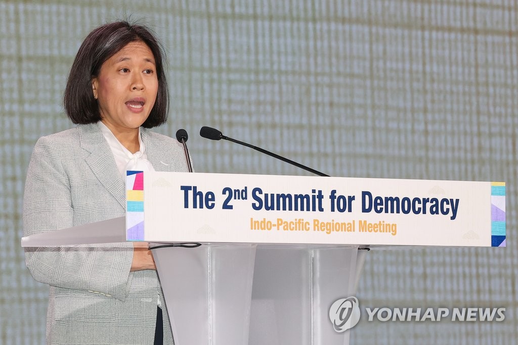 | ▲ U.S. Trade Representative Katherine Tai speaks during the opening ceremony of the Indo-Pacific Regional Meeting of the 2nd Summit for Democracy at a hotel in Seoul on March 30, 2023. (Yonhap) |