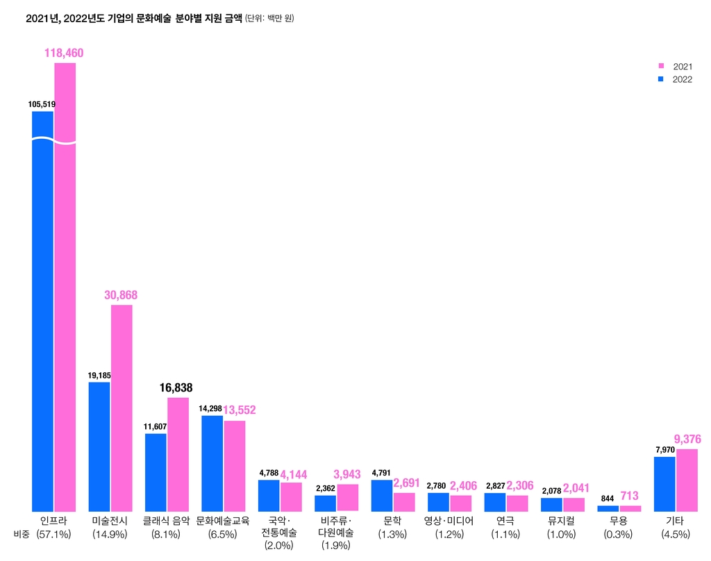 분야별로 살펴보면 지난해 기업들은 미술·전시, 클래식, 인프라 분야에 지원을 늘렸다.