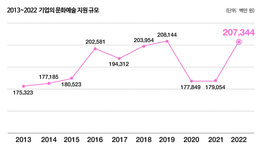 지난해 기업들의 문화예술 분야 지원 규모는 코로나 이전인 2019년 수준을 회복했고, 미술·전시 지원금은 전년 대비 60.9%, 클래식 지원금은 45.1% 늘었다.