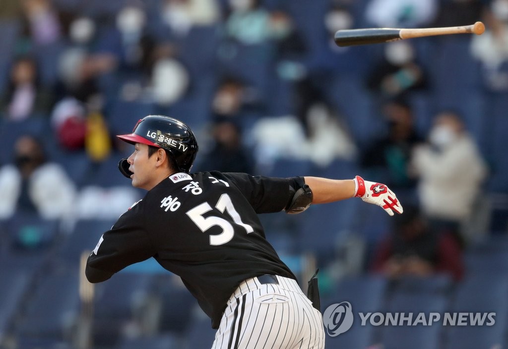 ▲ In this file photo from Oct. 17, 2021, Hong Chang-ki of the LG Twins flips his bat after hitting a double against the NC Dinos in the top of the fifth inning of a Korea Baseball Organization regular season game at Changwon NC Park in Changwon, some 400 kilometers southeast of Seoul. (Yonhap)