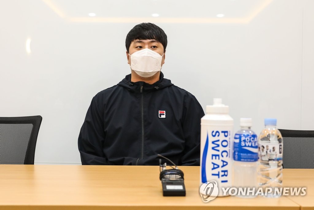 ▲ Lee Young-ha of the Doosan Bears speaks at a press conference at Jamsil Baseball Stadium in Seoul on Nov. 4, 2021, before playing the LG Twins in the first round of the Korea Baseball Organization postseason. (Yonhap)