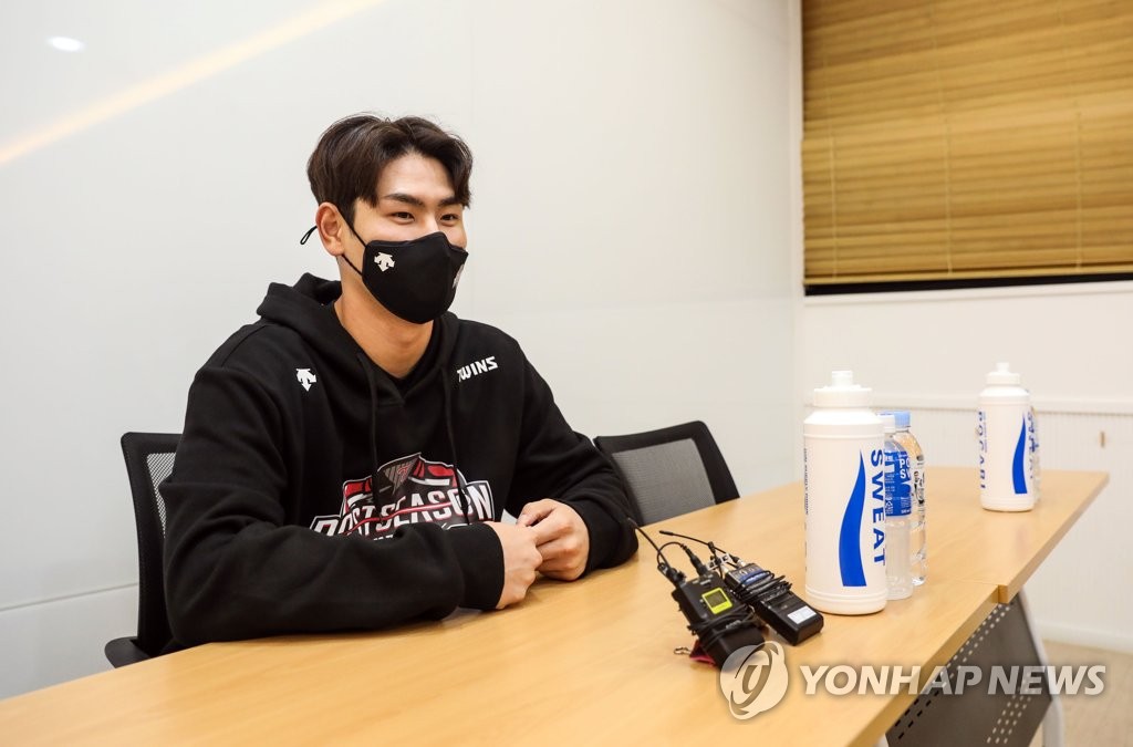 ▲ Hong Chang-ki of the LG Twins speaks at a press conference at Jamsil Baseball Stadium in Seoul on Nov. 4, 2021, before playing the Doosan Bears in the first round of the Korea Baseball Organization postseason. (Yonhap)