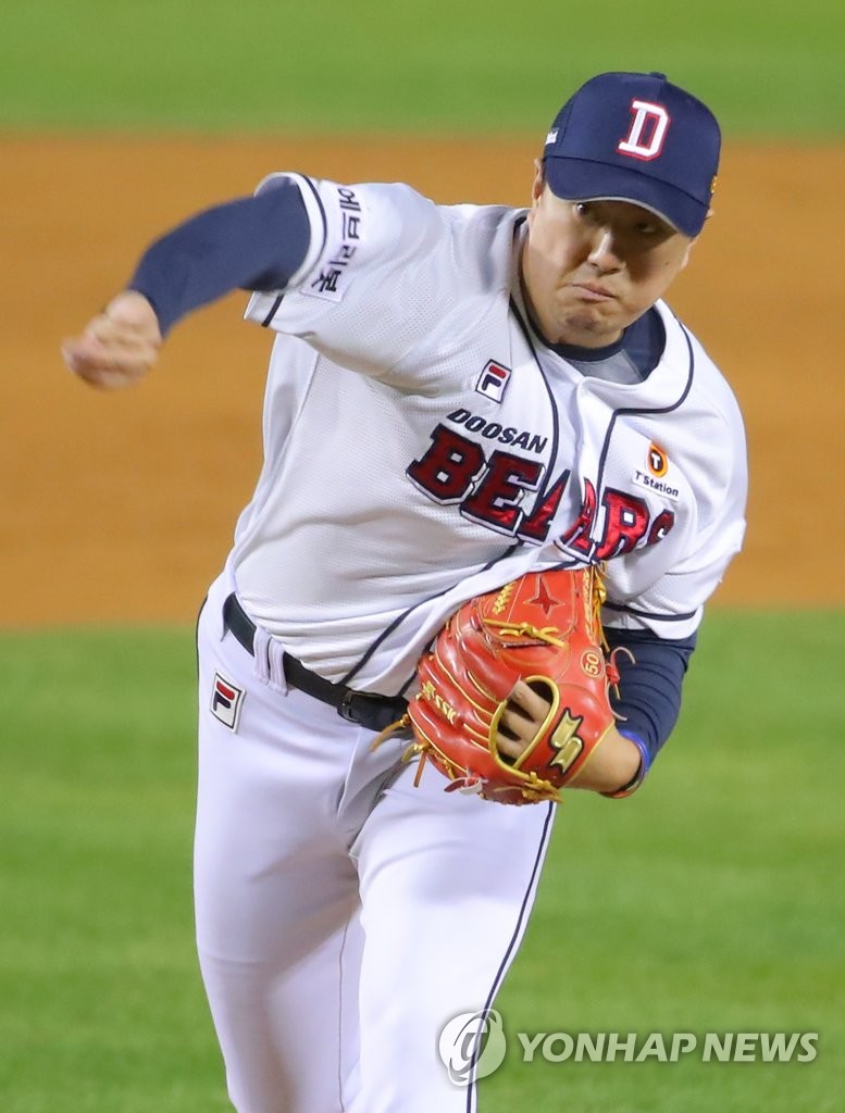 ▲ Lee Young-ha of the Doosan Bears pitches against the Kiwoom Heroes in the top of the fifth inning of the second wild card game in the Korea Baseball Organization postseason at Jamsil Baseball Stadium in Seoul on Nov. 2, 2021. (Yonhap)