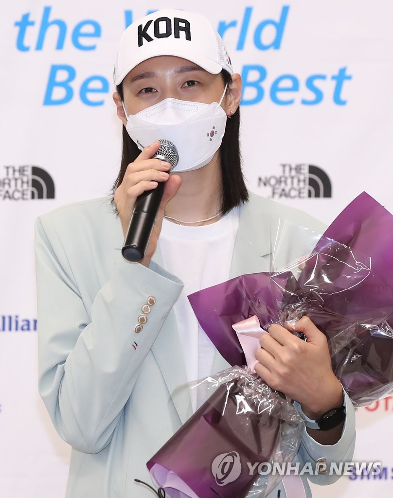 | ▲ South Korean volleyball star Kim Yeon-koung speaks to reporters at Incheon International Airport, west of Seoul, on Aug. 9, 2021, after returning home from the Tokyo Olympics. (Yonhap) |