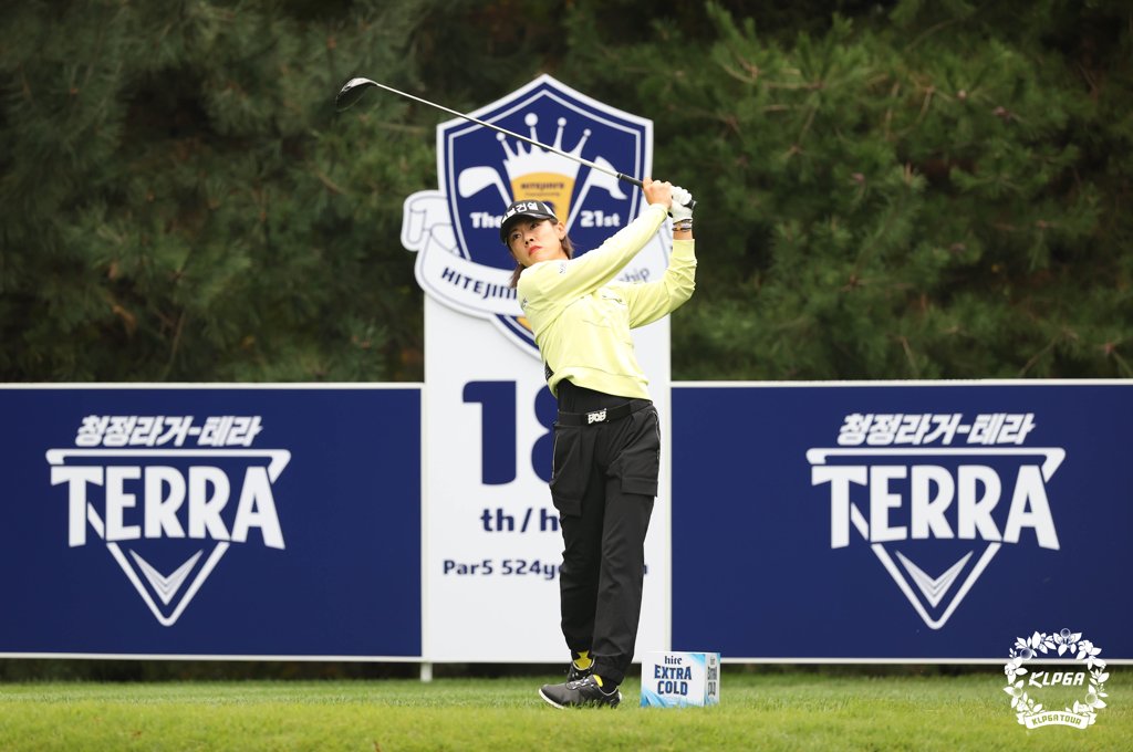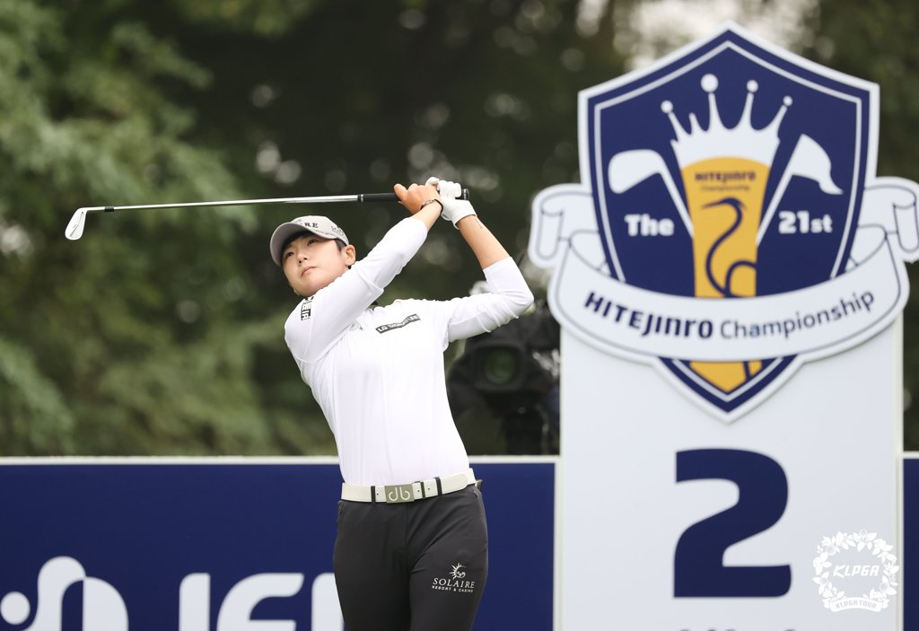 ▲ 티샷하는 박주영 (서울=연합뉴스) 7일 경기 여주 블루헤런GC에서 열린 한국여자프로골프(KLPGA) 투어 제21회 하이트진로 챔피언십 1라운드 18번 홀에서 박주영이 티샷하고 있다. 2021.10.7 [KLPGA 제공. 재판매 및 DB 금지] photo@yna.co.kr