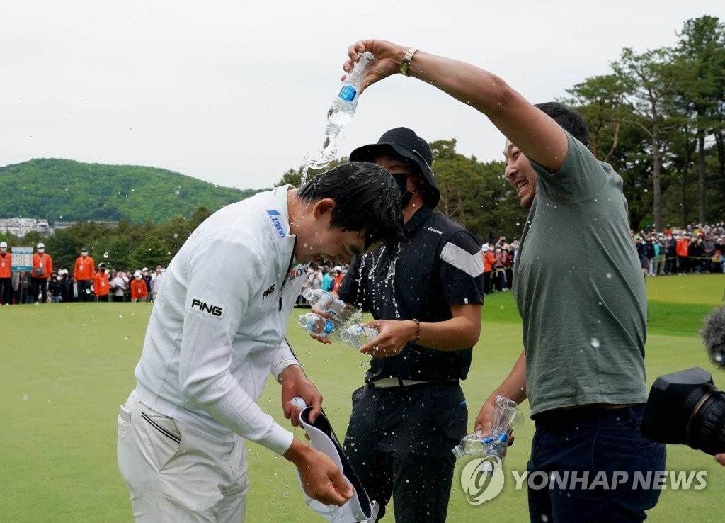 | ▲ 우승 축하 물세례 받는 김비오 (서울=연합뉴스) 김비오가 8일 경기도 성남 남서울 컨트리클럽에서 열린 GS 칼텍스 매경오픈에서 우승을 차지한 뒤 축하 물세례를 받고 있다. 2022.5.8 [GS 칼텍스 매경오픈 조직위원회 제공. 재판매 및 DB금지] photo@yna.co.kr |