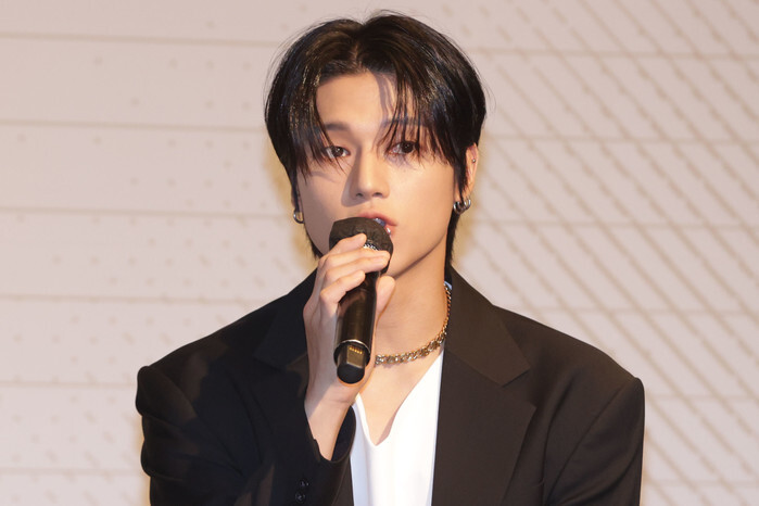Wooyoung, a member of South Korean boy group Ateez, speaks during a showcase in Seoul on May 30, 2024, to promote the release of the group's tenth mini album "Golden Hour: Part. 1." (Yonhap)