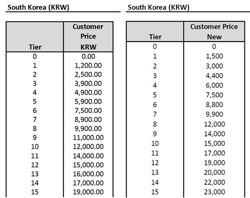 그러나 새로 적용되는 가격표는 1단계가 1천500원, 2단계가 3천 원, 3단계가 4천400원이고 10단계는 1만5천 원, 87단계는 149만 원 등 20∼25%가량 올랐다.