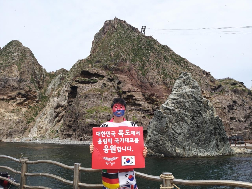 레드엔젤 응원단은 이날 오후 경북 울릉군 울릉읍 독도 선착장에 내려 '대한민국 독도에서 올림픽 국가대표를 응원합니다'란 현수막과 깃발, 피켓 등을 들고 응원을 펼쳤다.
