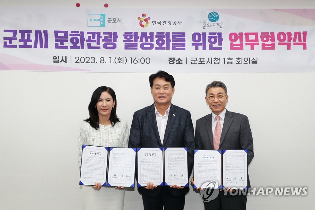 (군포=연합뉴스) 김인유 기자 = 경기 군포시는 1일 시청에서 한국관광공사, 군포문화재단과 '군포시 문화관광활성화를 위한 업무협약'을 체결했다.