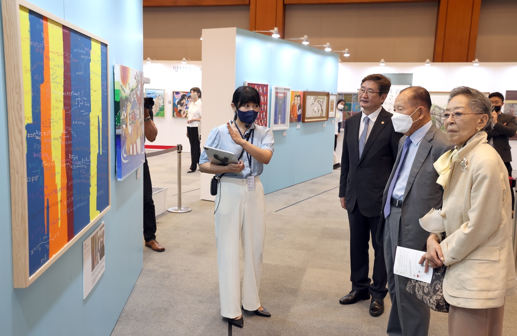 ▲ 배우 김지미와 김동호 전 강릉국제영화제 이사장이 8일 청와대 춘추관에서 열리고 있는 장애예술인 특별전을 관람했다. 두 사람은 김현우의 '퍼시잭슨, 수학드로잉'과 정은혜의 '영옥과 영희' 등 60여 점을 감상하고 박보균 문화체육관광부 장관도 만났다. 김지미는 "흥미롭고 감동적인 예술 여정이었다"고 소감을 전했다. (서울=연합뉴스)