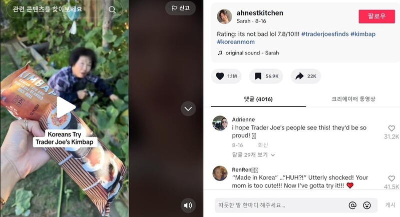 로스앤젤레스(LA) 옆 오렌지카운티에 사는 한인 음식 블로거 세라 안(27)이 어머니와 함께 이 김밥을 데워 함께 먹어보는 영상을 지난달 16일 틱톡에 올렸는데, 이 영상의 조회수는 1천100만회를 넘었다.