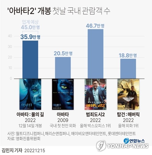 | ▲ [그래픽] '아바타2' 개봉 첫날 국내 관람객 수 (서울=연합뉴스) 김민지 기자 = minfo@yna.co.kr 트위터 @yonhap_graphics 페이스북 tuney.kr/LeYN1 |