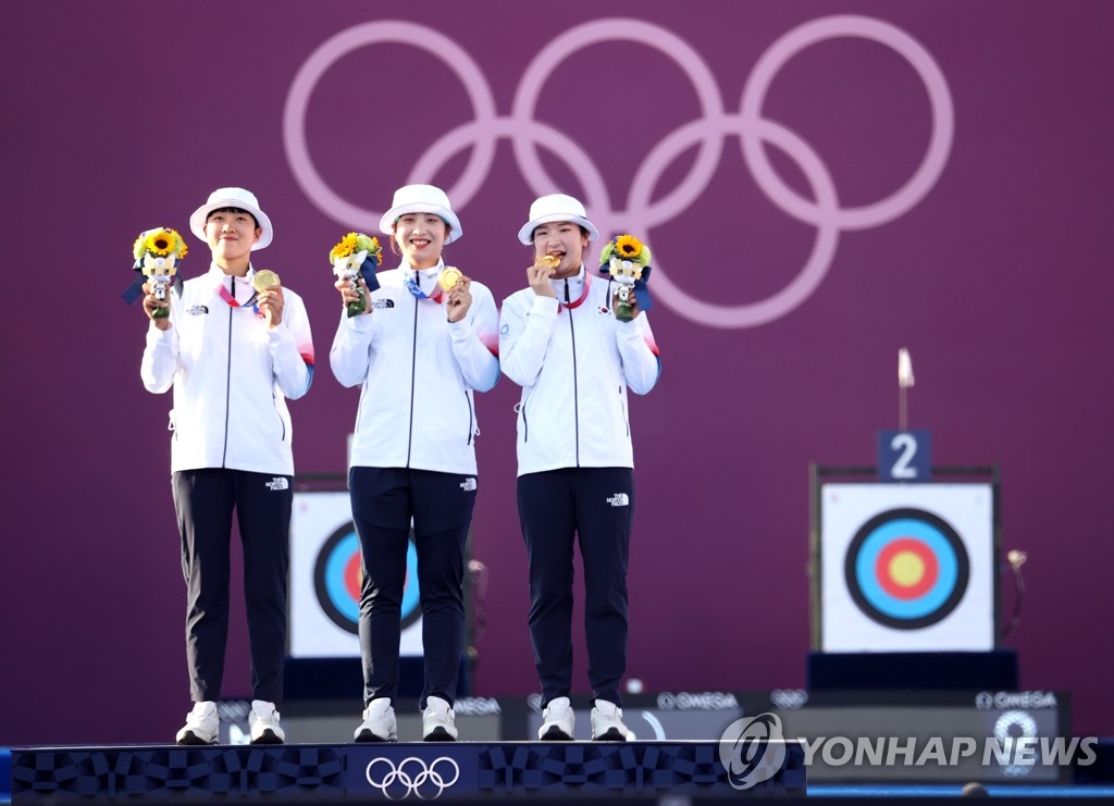 Kang, An San and Jang Min-hee won the women's team gold over the Russian Olympic Committee by the set sore of 6-0 on Sunday at Yumenoshima Park Archery Field in the Japanese capital.