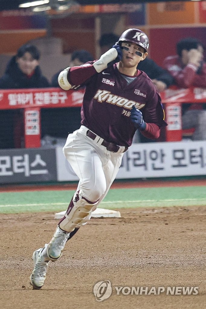 | ▲ In this file photo from Nov. 8, 2022, Lee Jung-hoo of the Kiwoom Heroes celebrates after hitting a solo home run against the SSG Landers during the top of the sixth inning of Game 6 of the Korean Series at Incheon SSG Landers Field in Incheon, some 30 kilometers west of Seoul. (Yonhap) |