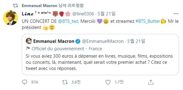 마크롱 대통령은 답글 3개를 자신의 계정에 리트윗했는데 그중 하나가 방탄소년단(BTS) 콘서트 티켓을 사겠다며 BTS의 신곡 '버터'를 홍보하는 내용이었다.