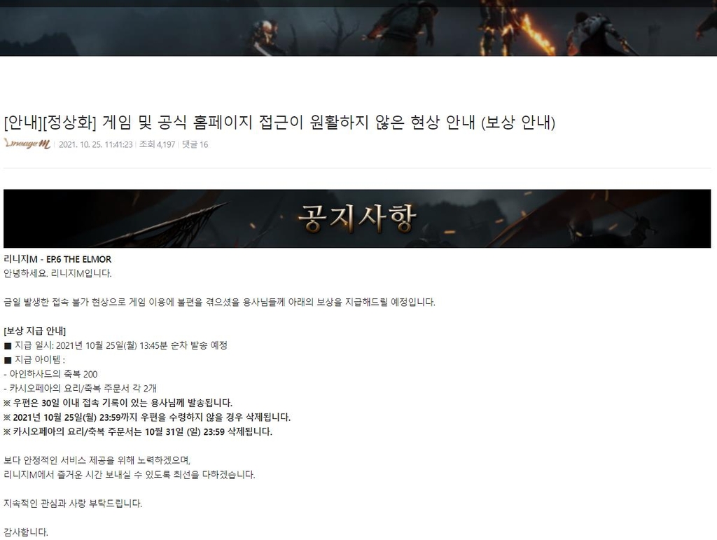 이후 정상 접속이 이뤄지자 게임에 접속할 수 있다는 공지도 올렸다.