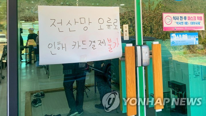 | ▲ KT망 장애 "카드 결제 안 됩니다" (구례=연합뉴스) 장아름 기자 = 25일 오전 KT 인터넷망이 전국적으로 한 시간 넘게 장애를 일으키면서 전남 구례군 마산면 한 식당 입구에 '전산망 오류로 인해 카드 결제 불가' 안내문이 붙어 있다. 2021.10.25 areum@yna.co.kr |