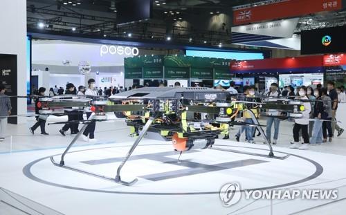 | ▲ Visitors look at hydrogen-powered drones at the 2022 H2 Mobility, Energy Environment Technology (MEET), the country's biggest hydrogen industry fair, at KINTEX in Goyang, northwest of Seoul, on Aug. 31, 2022. (Yonhap) |