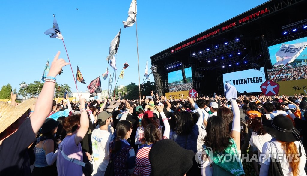 | ▲ 폭염 속 '록의 열기' (인천=연합뉴스) 임순석 기자 = 4일 오후 인천시 연수구 송도달빛축제공원에서 열린 2023 인천 펜타포트 록 페스티벌에서 밴드 더 발룬티어스의 공연에 참가자들이 열광하고 있다. 2023.8.4 soonseok02@yna.co.kr |