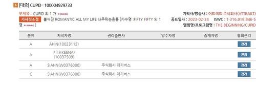 | ▲ 피프티 피프티 '큐피드' 저작권 현황 [한국음악저작권협회 홈페이지 캡처.재판매 및 DB 금지] |