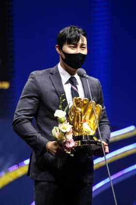 ▲ Kiwoom Heroes' shortstop Kim Ha-seong gives an acceptance speech after winning a Golden Glove at the awards ceremony in Seoul on Dec. 11, 2020, in this photo provided by the Korea Baseball Organization. (PHOTO NOT FOR SALE) (Yonhap)