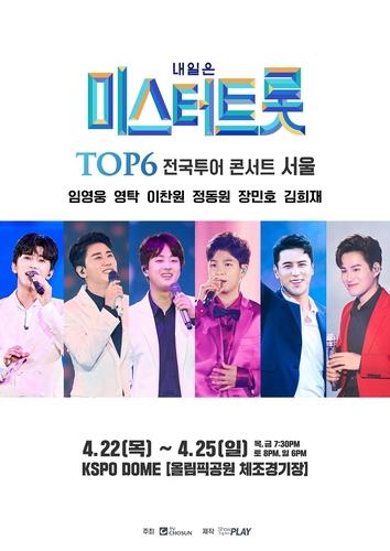 공연 제작사 쇼플레이는 이달 16∼18일 부산 공연으로 시작될 예정이던 '내일은 미스터트롯 톱6 전국투어 콘서트' 4·5월 공연 일정을 무기한 연기한다고 9일 공지했다.
