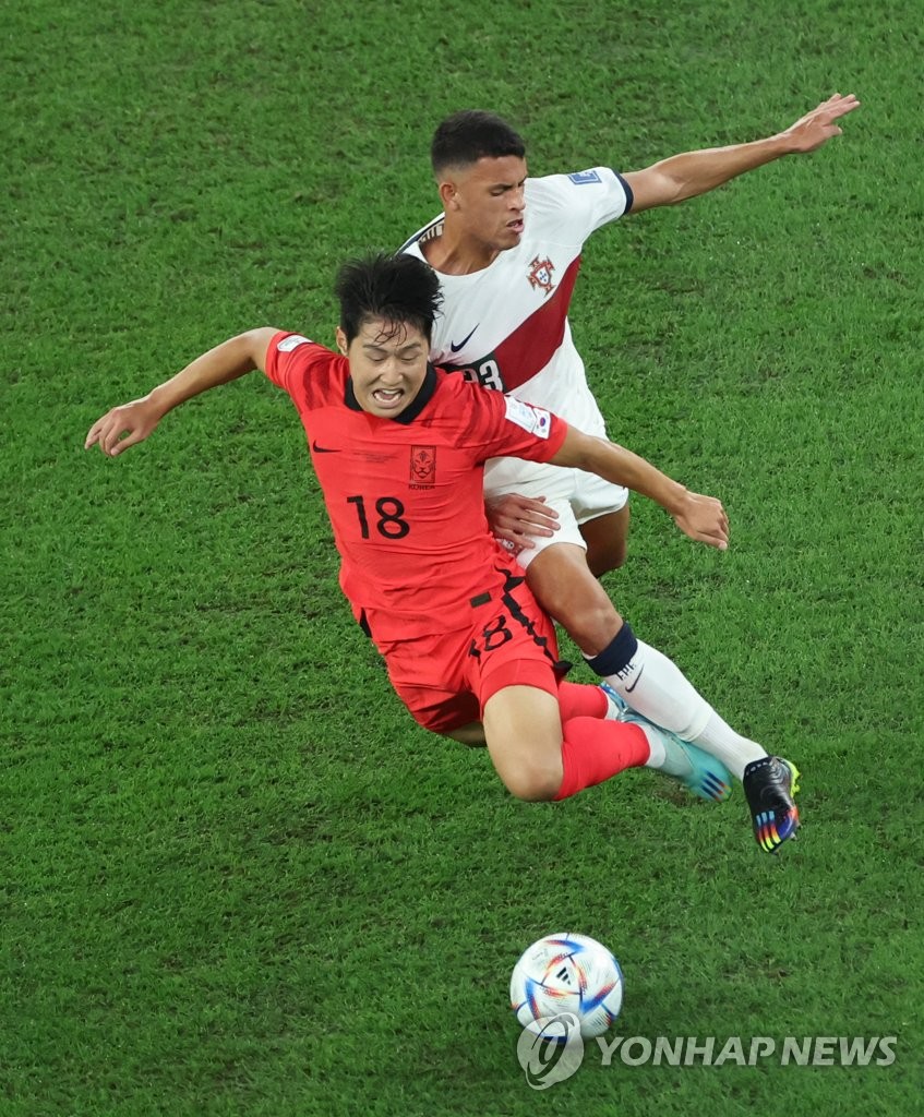 | ▲ Lee Kang-in of South Korea (L) and Matheus Nunes of Portugal battle for the ball during the countries' Group H match at the FIFA World Cup at Education City Stadium in Al Rayyan, west of Doha, on Dec. 2, 2022. (Yonhap) |