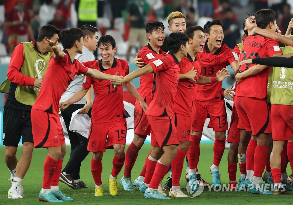 | ▲ South Korean players celebrate their 2-1 victory over Portugal in the teams' Group H match that sent them to the round of 16 at the FIFA World Cup at Education City Stadium in Al Rayyan, west of Doha, on Dec. 2, 2022. (Yonhap) |
