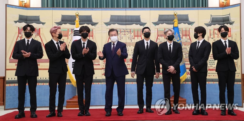 우선 문 대통령은 "K-팝, K-문화 위상을 더없이 높이 올려줌으로써 대한민국의 품격을 높여줬다"고 했다.
