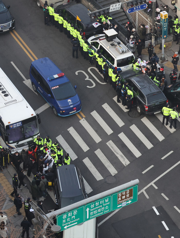 A Justice Ministry vehicle (C) carrying arrested President Yoon Suk Yeol leaves the Constitutional Court in Seoul on Jan. 21, 2025, en route to the Seoul Detention Center in Uiwang, just south of the capital, after he attended the third hearing of his impeachment trial in connection to his short-lived imposition of martial law in December. (Yonhap)