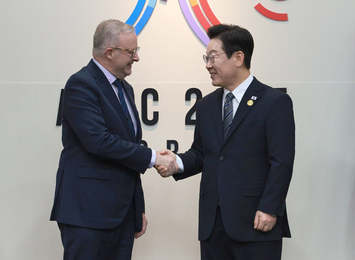 South Korean President Lee Jae Myung (R) shakes hands with Australian Prime Minister Anthony ahead of their talks in Gyeongju, North Gyeongsang Province, southeastern South Korea, on Oct. 30, 2025. (Pool photo) (Yonhap)