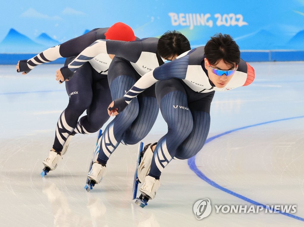 | ▲ South Korean speed skaters Kim Min-seok, Park Seong-hyeon and Kim Jun-ho (L to R) train at the National Speed Skating Oval in Beijing on Feb. 1, 2022, in preparation for the Beijing Winter Olympics. (Yonhap) |