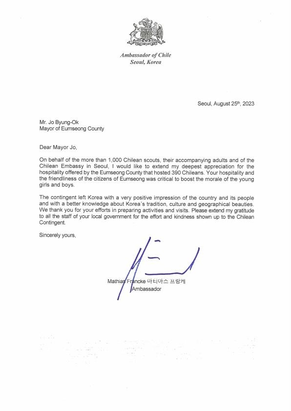 (음성=연합뉴스) 김형우 기자 = 마티아스 프랑케 주한 칠레대사가 31일 잼버리 대원을 환대와 친절로 지원해 준 충북 음성군에 지난 25일 감사의 뜻을 담은 서한을 보냈다.